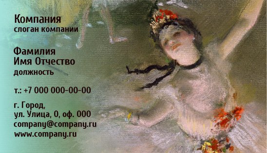 В данном разделе вы найдете визитки категории «Культура», предназначенные для использования в разных направлениях: «Изобразительное искусство», «Танцы, хореография, балет», «Блоггеры, писатели», «Боди-арт», «Антиквариат», «Кинотеатры», «Музыка», «Скульптура», «Театры». Каждая визитная карточка имеет соответствующее дизайнерское оформление. Единожды увидев визитку, можно сразу догадаться, к какой отрасли она относится.